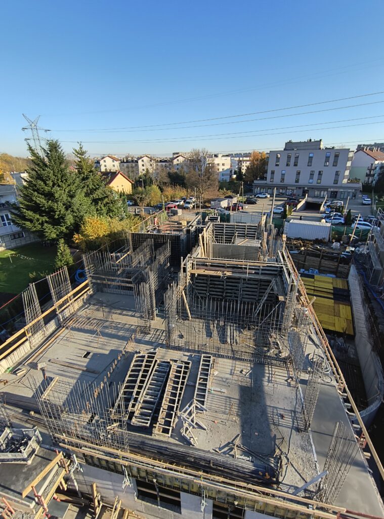 Aktualnie, zgodnie z harmonogramem trwają prace przy wznoszeniu drugiego piętra. Wraz z nim w górę pną się już pierwsze balkony – przyszłe oazy spokoju i relaksu dla naszych mieszkańców.